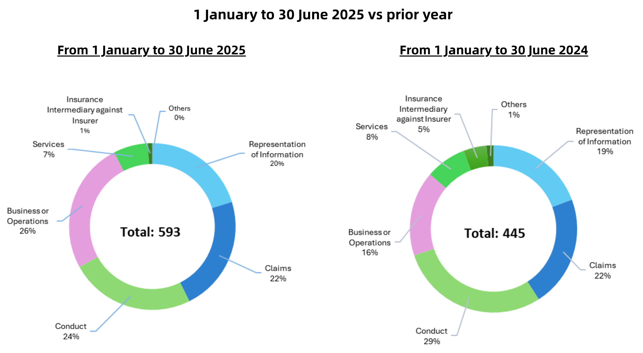 The statistics show a 33% increase in complaints to the IA during the first six months of 2025 (593 complaints), as compared with the same six months in 2024 (445 complaints) – an increase of 148 complaints in total.
