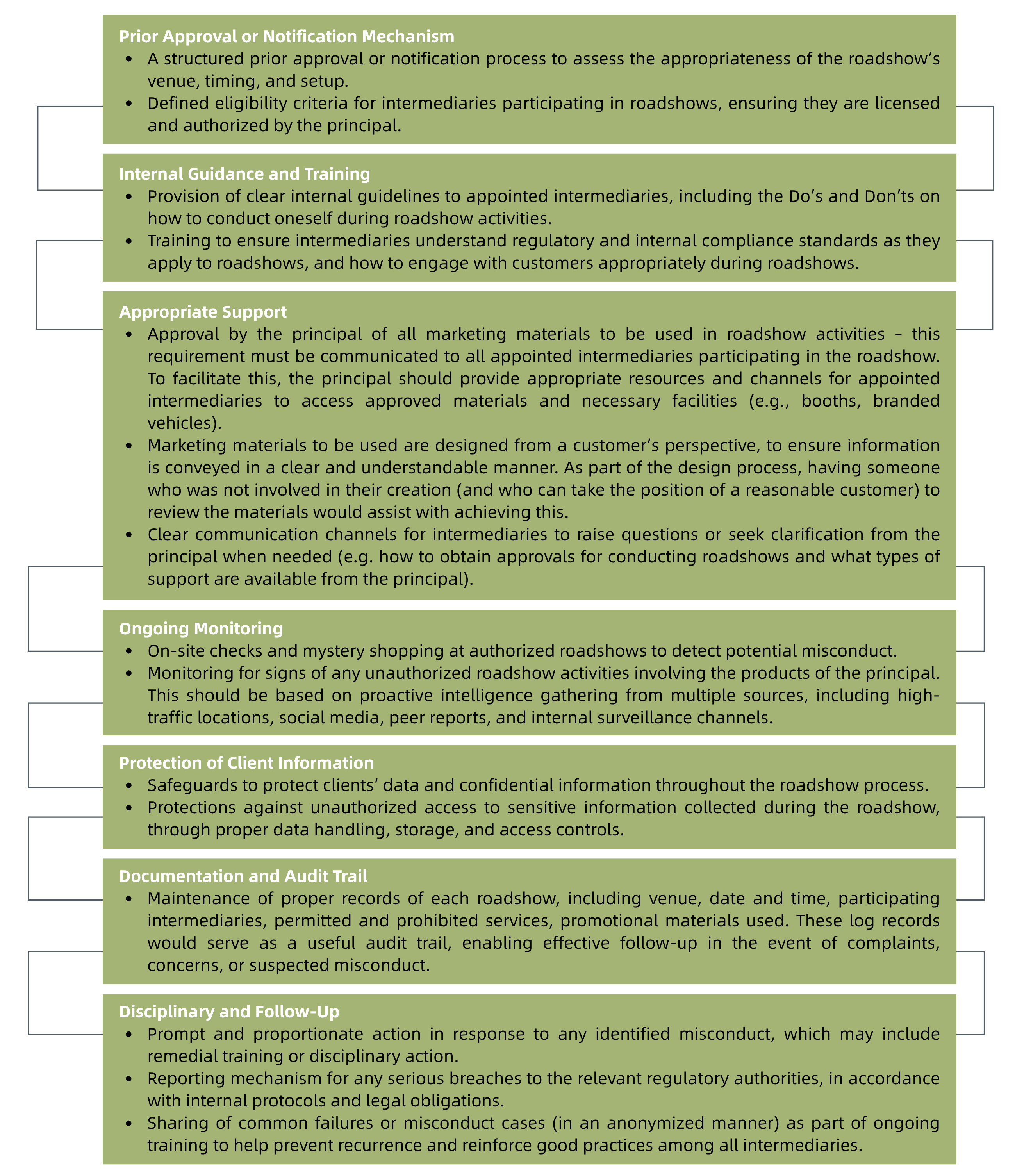 An effective control and governance framework put in place by principals for roadshow activities might include the following elements: