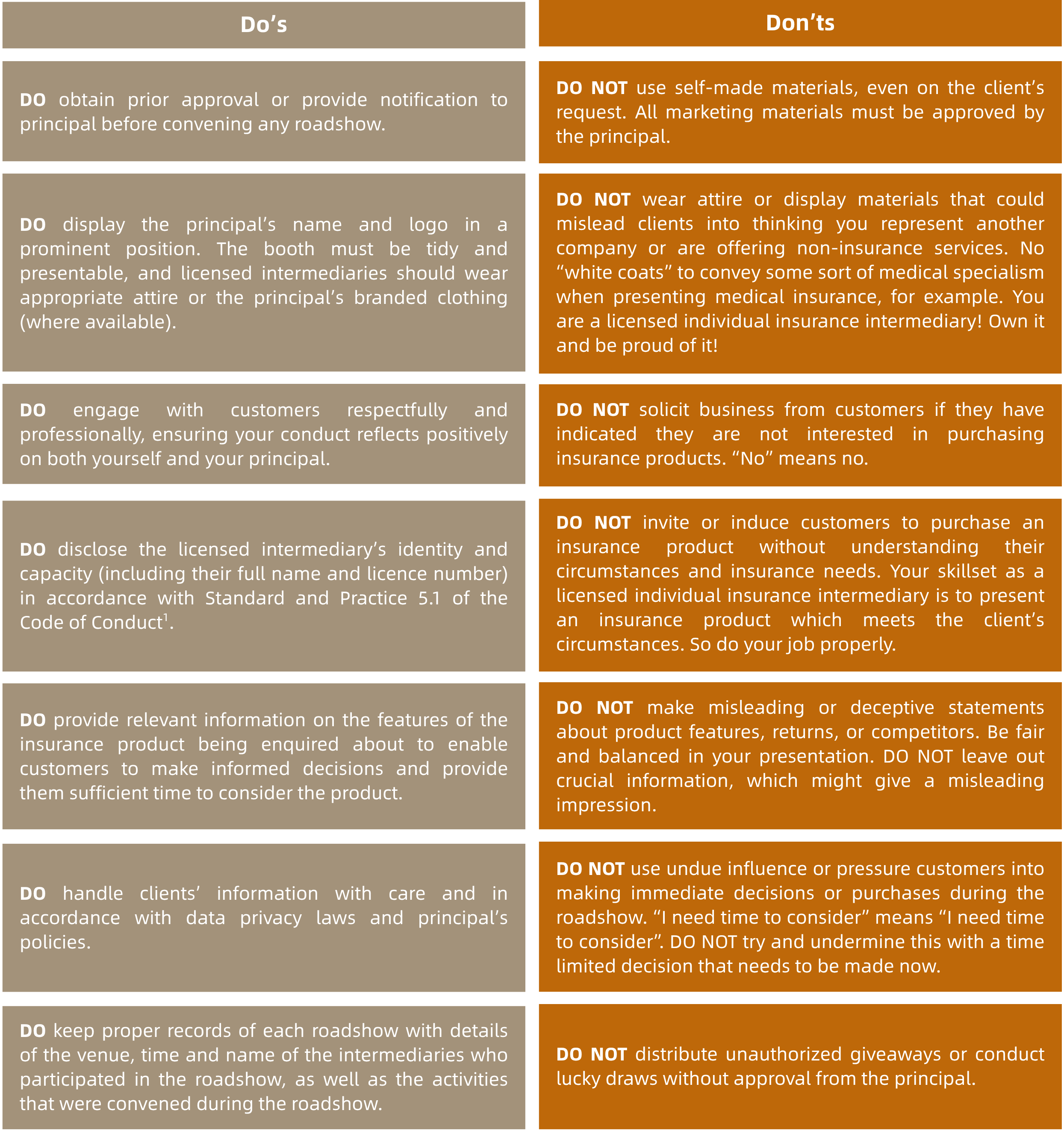 We also provide the following key Do’s and Don’ts to assist licensed individual insurance intermediaries who participate in roadshow exercises, to understand their conduct obligations: