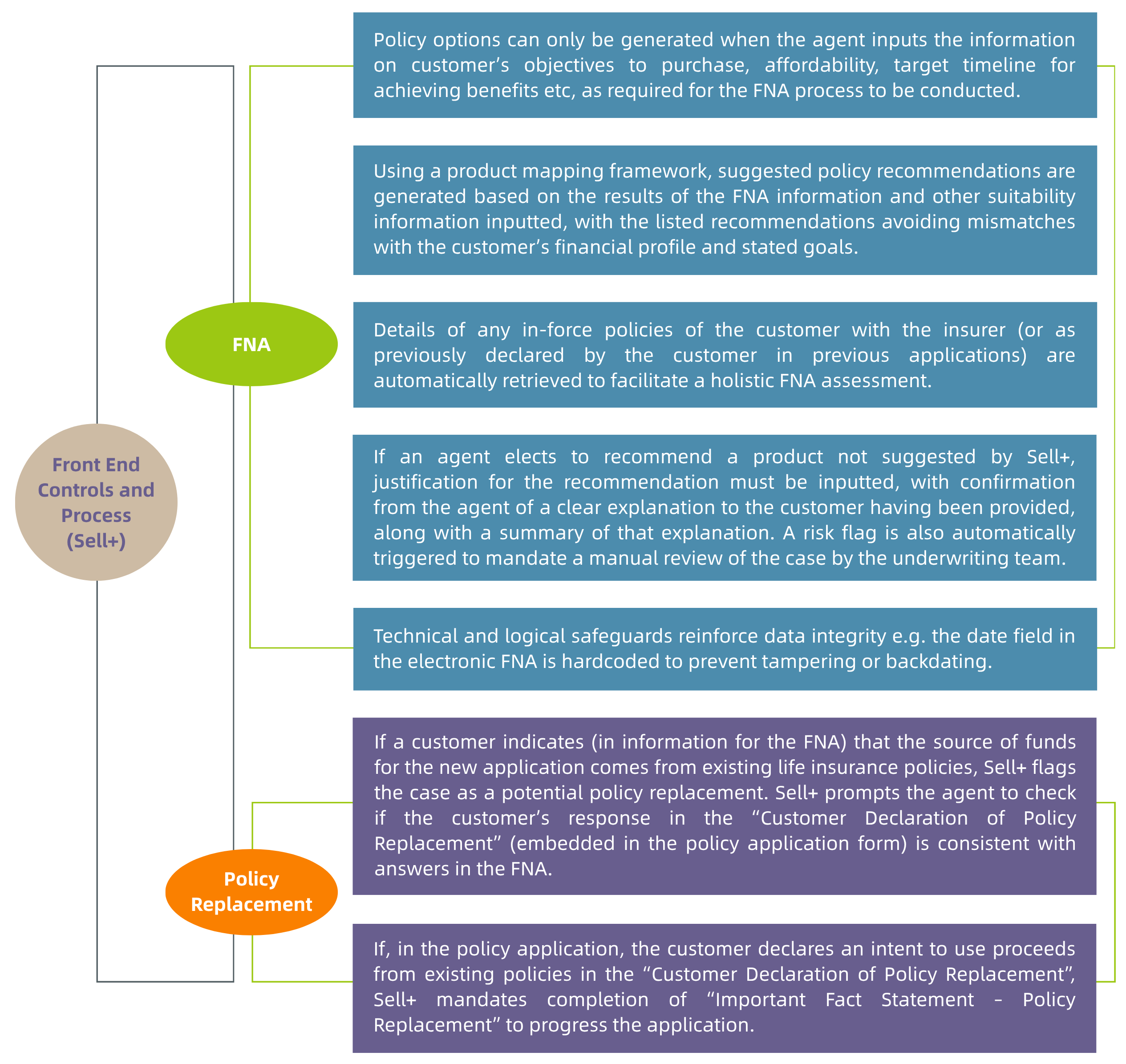 Sell+ integrates the front-end application utilized by the agents, with the insurer’s back-end underwriting systems and feeds from various data repositories of the insurer. This enables validation and monitoring controls for the FNA process and policy replacements to be applied across multiple layers in the insurer’s operation. The underwriting controls and processes provide a second layer of review. A third layer of controls and processes is provided through pattern analysis functionality in Sell+ that identifies patterns utilizing a holistic view of all historic applications submitted by an agent that can trigger red-flags for potential mis-selling.