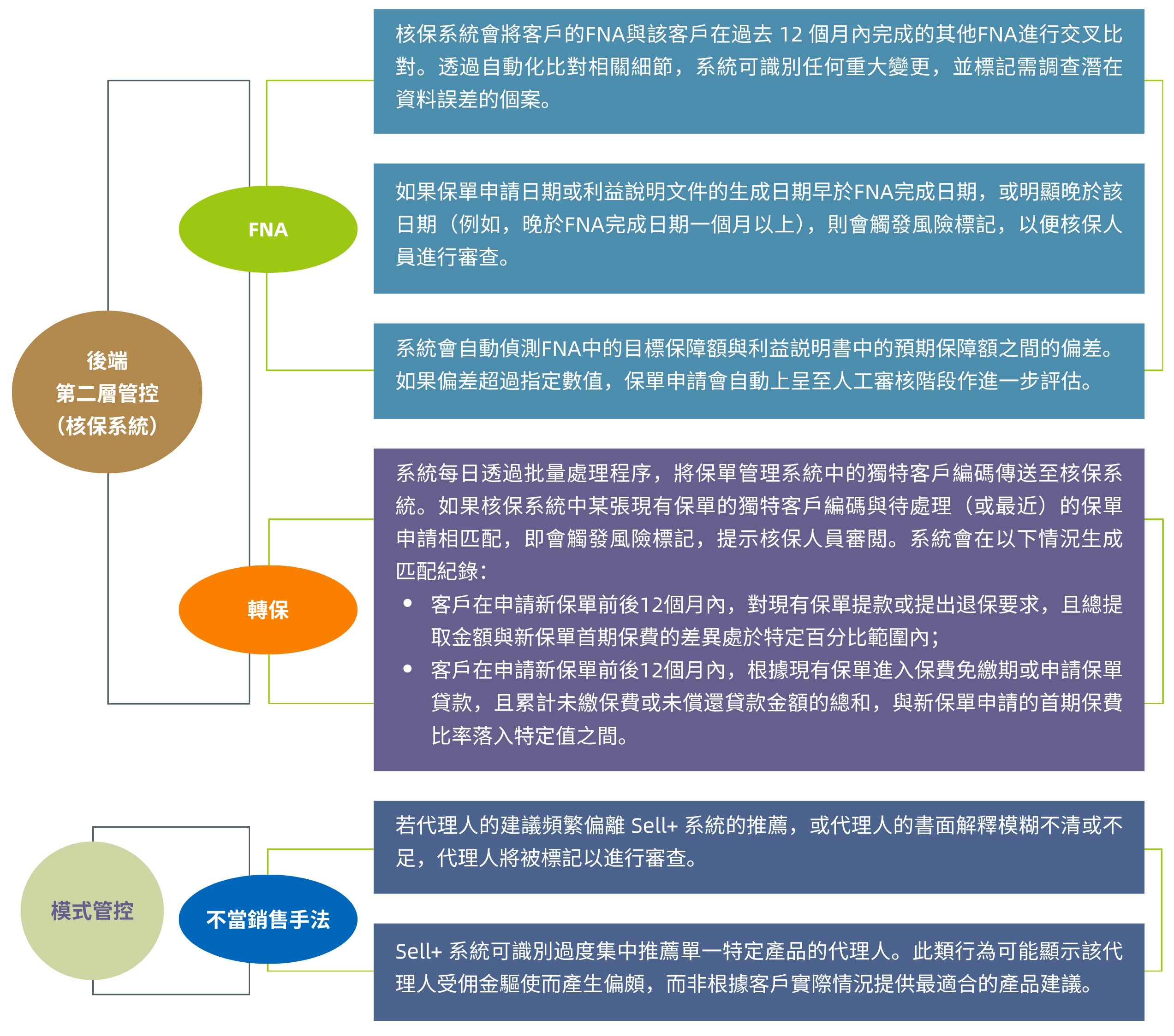 Sell+ 整合了代理人使用的前端应用程式、保险人的后端核保系统,以及来自保险人各种资料库的资料。这令相关人员可以在保险人营运过程中的多个不同层级,对FNA的流程和转保的管控进行验证及监察。核保的流程和相关管控措施,将构成第二层审查机制。另Sell+的模式分析功能,则可提供第三层的管控和流程,其相关功能可以整合代理人过往提交的所有申请纪录,进行全面分析,识别出有哪些因为可能存在不当销售行为而触发警报的模式。