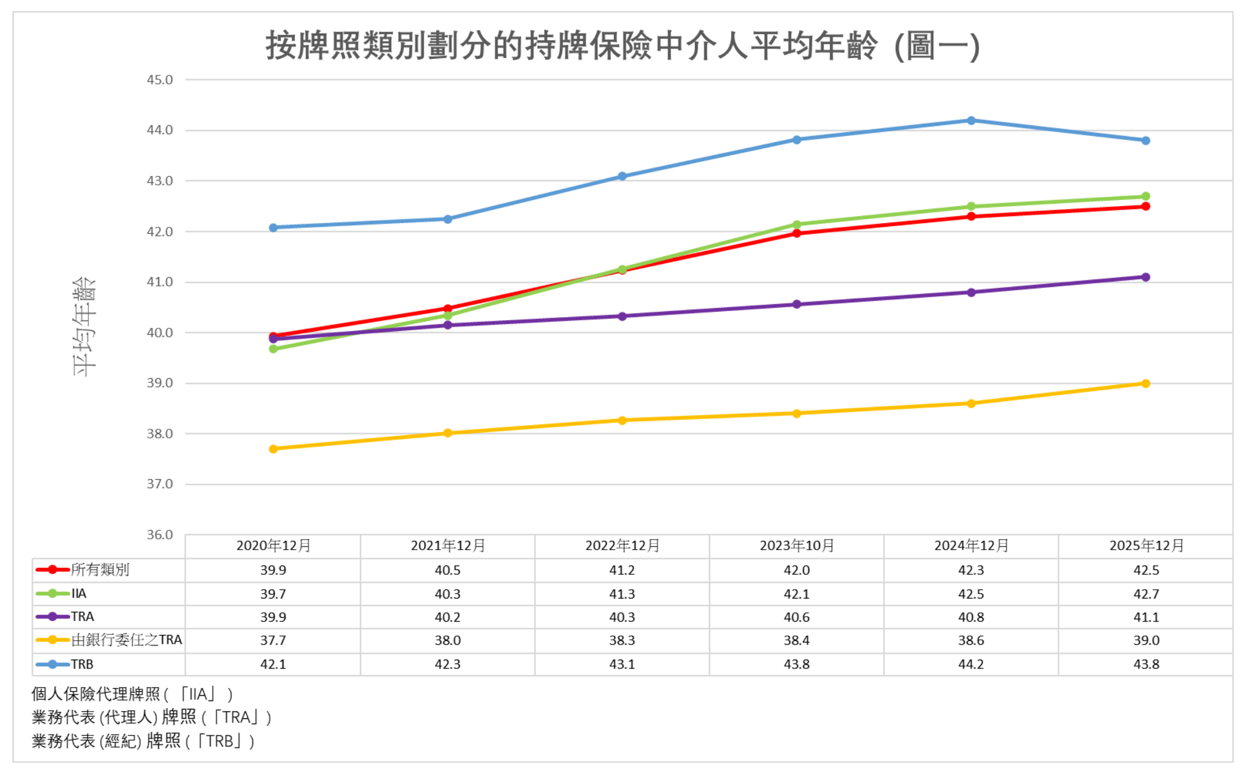 业务代表(经纪)的平均年龄为 43.8 岁,仍然是所有牌照类别中最为(姑且这样形容)成熟的一组。然而,此数字自 2023 年 10 月以来并无变化,显示经纪市场于过去两年或已有较年轻新入行者加入。相反,个人保险代理的平均年龄由 2023 年 10 月的 42.1 岁上升至 2025 年 12 月的 42.7 岁(上升 0.6 岁)。
