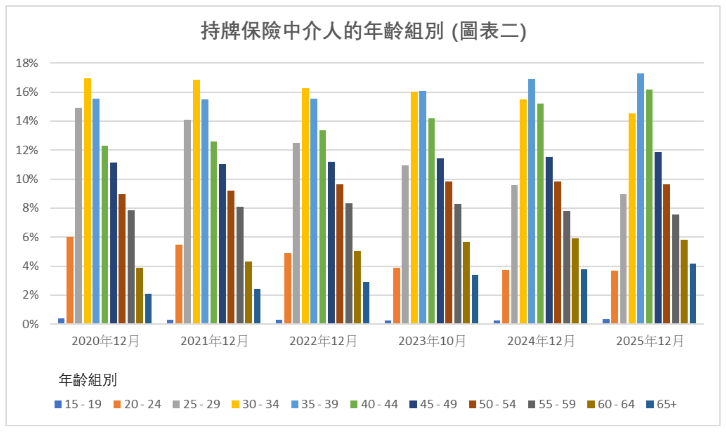 同样地,业务代表(代理人)的平均年龄亦由 2023 年 10 月的 40.6 岁上升至 2025 年 12 月的 41.1 岁(上升 0.5 岁)。尽管如此,业务代表(代理人)仍为所有牌照类别中最年轻的一组,主要归因于银行体系内相对年轻的业务代表(代理人),其于 2025 年 12 月的平均年龄为 39.0 岁(上升 0.6 岁)。