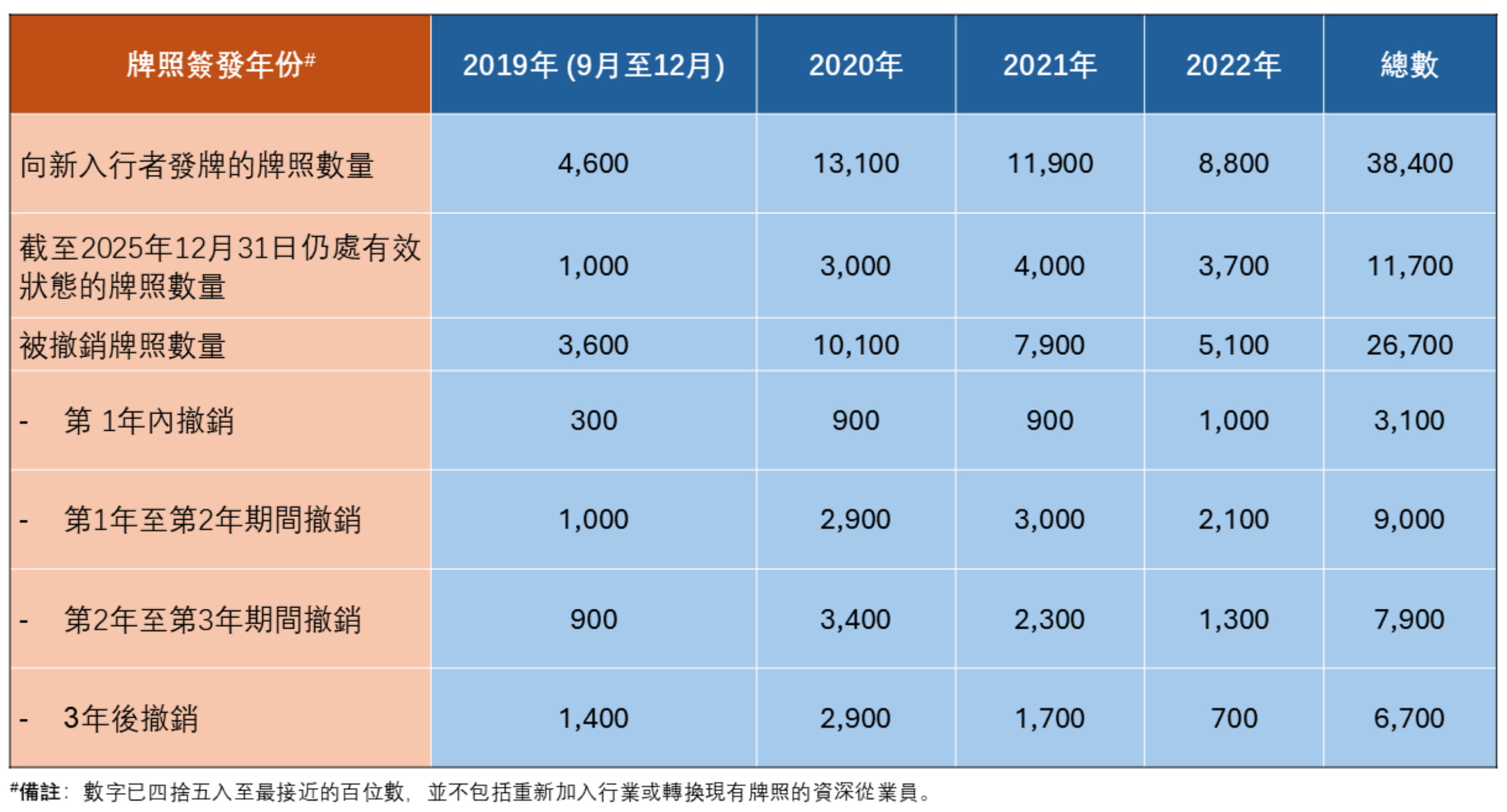 数据同时显示新入行人士于早期阶段持续高流失率:于两个检视期内,超过 50% 的新牌照于三年内被撤销。以下为该等新入行人士的主要数据: