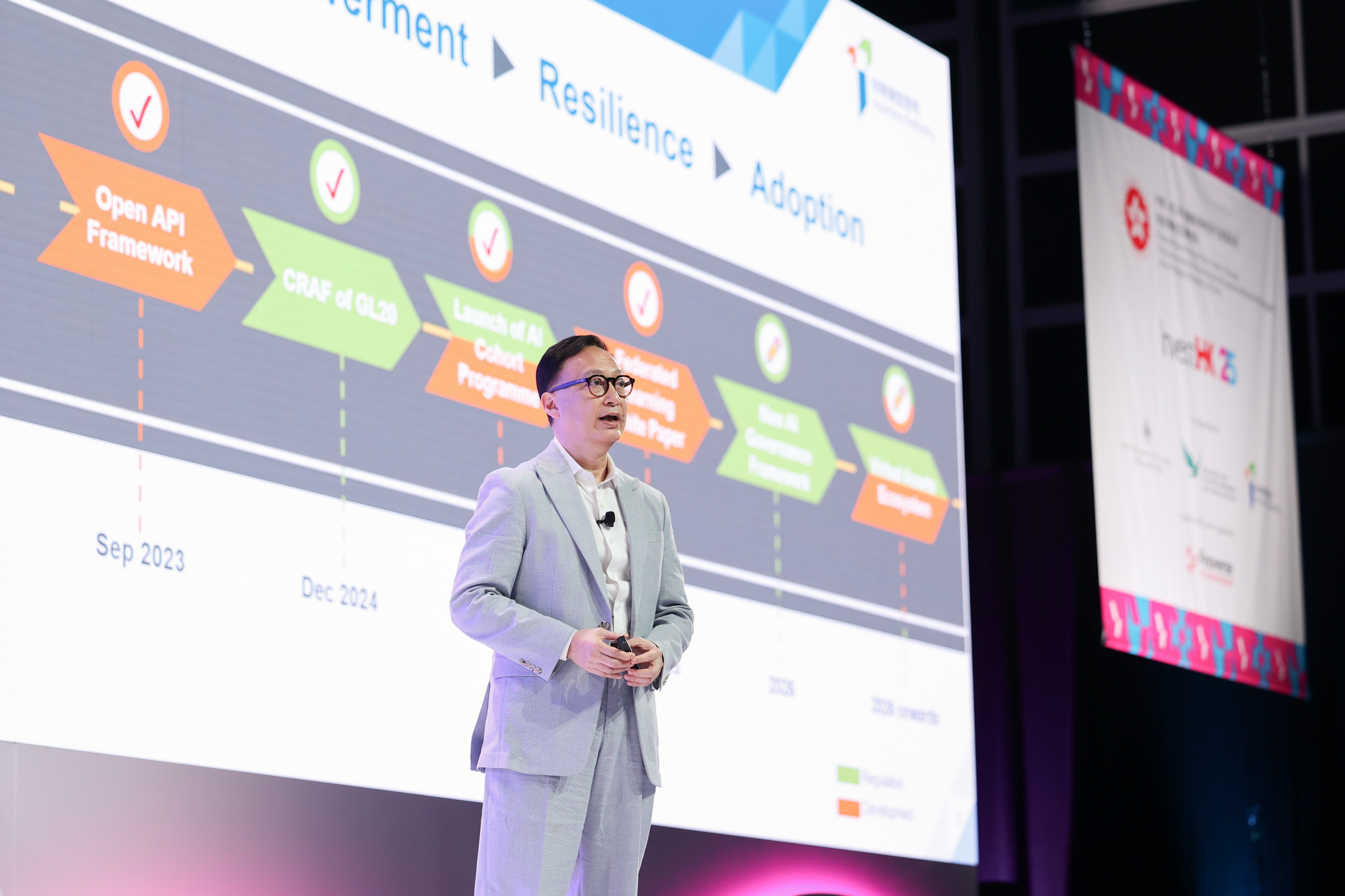 張先生在主題演講中亦重點分享由保監局牽頭的一系列措施,以推動高端科技應用並加強保險業的營運韌性,當中包括開放應用程式介面框架、網絡防衛評估框架、人工智能促進計劃,以及聯盟式學習白皮書。