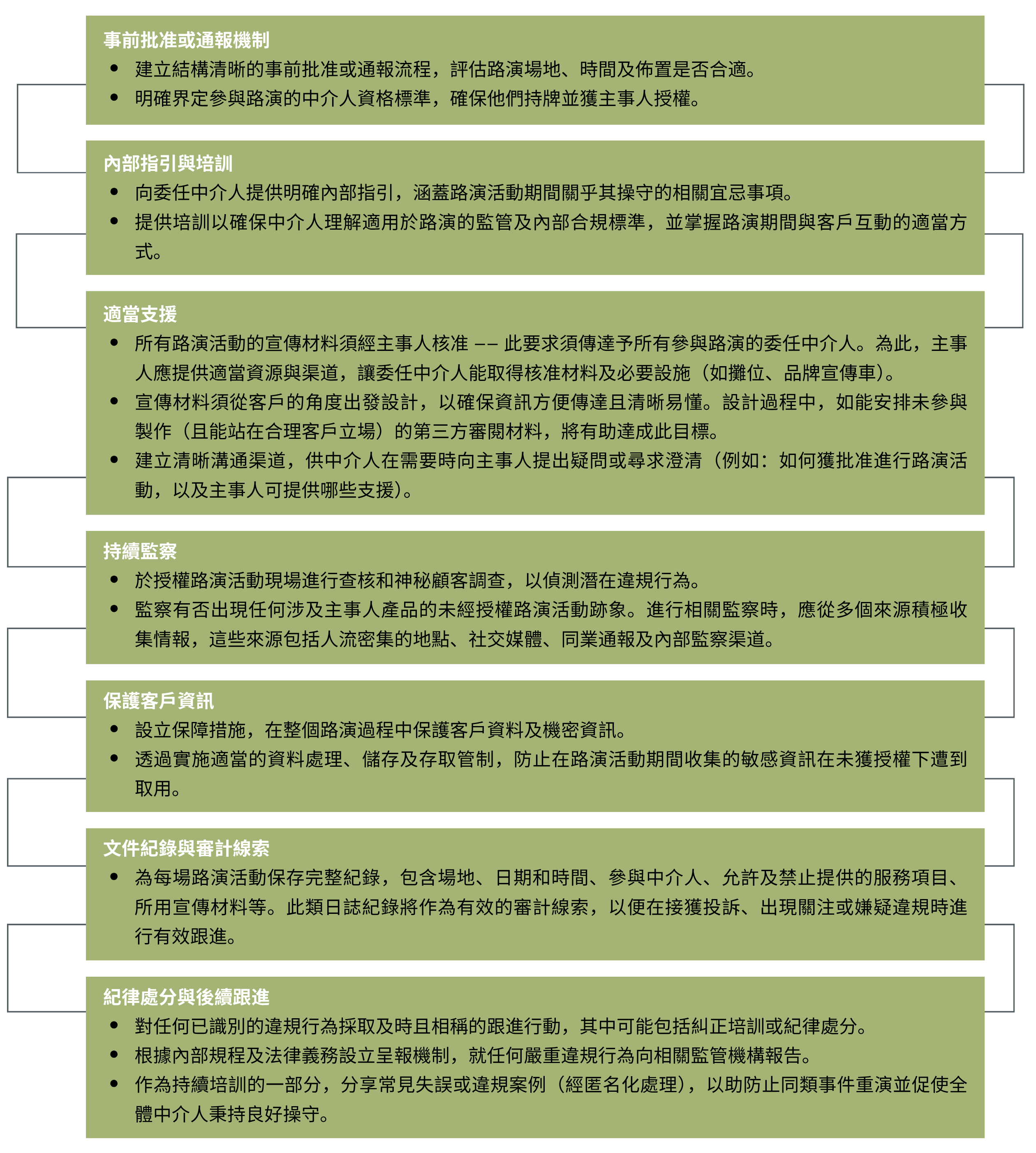 主事人為路演活動建立的有效管控與管治框架可包含以下要素:
