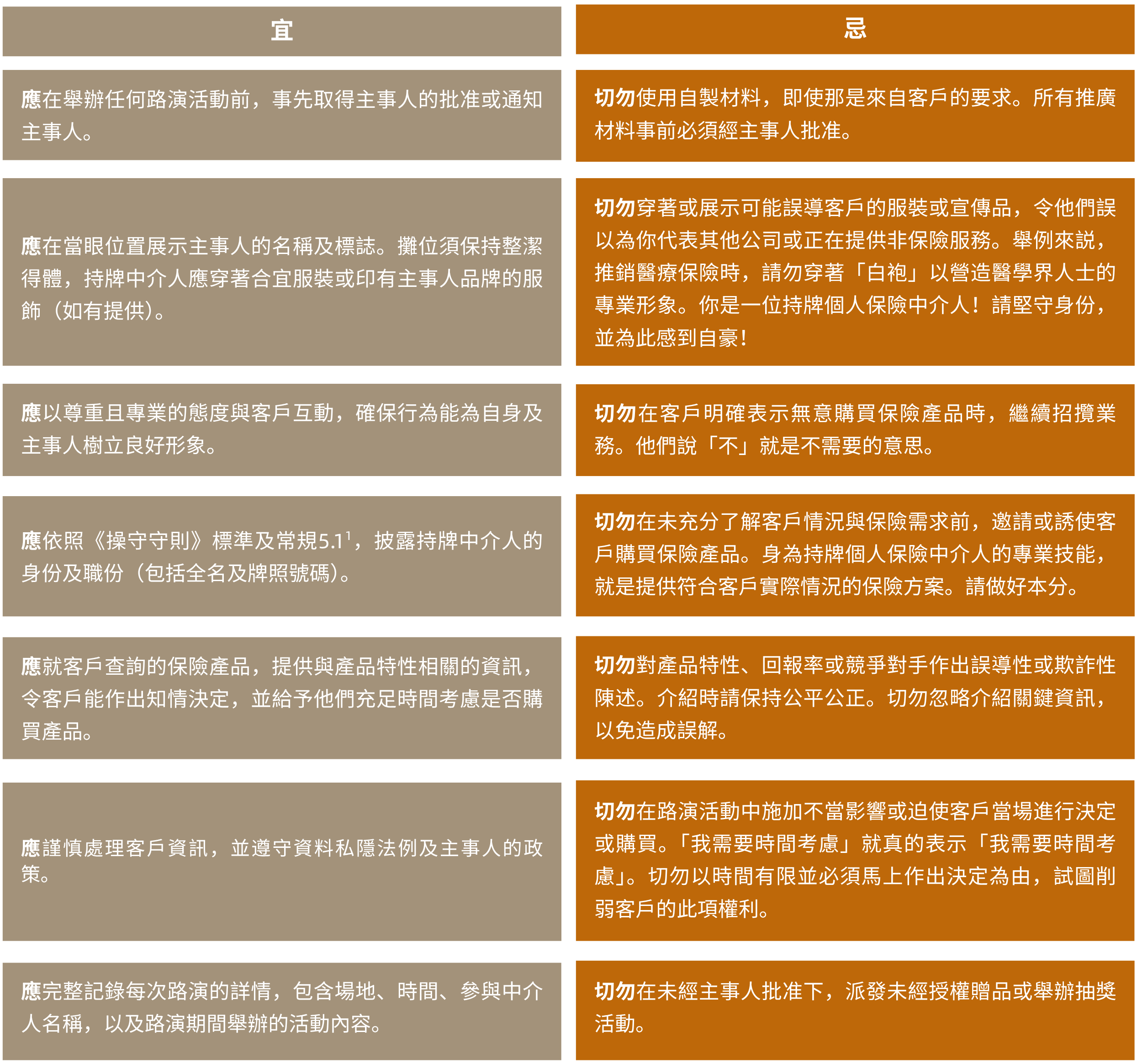 我們同時列出以下關鍵宜忌事項,以協助參與路演活動的持牌個人保險中介人理解其操守義務: